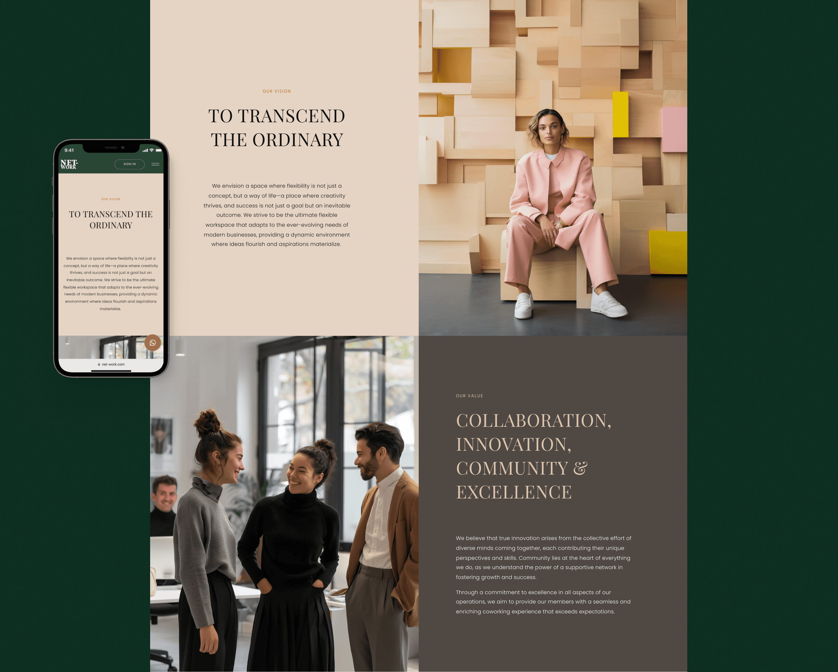The design solutions for the NET-WORK website were driven by the need to establish a strong digital presence for a new coworking space brand while ensuring flexibility for future growth. With the lack of pre-existing content and branding guidelines, the design emphasized clarity, scalability, and a premium user experience.